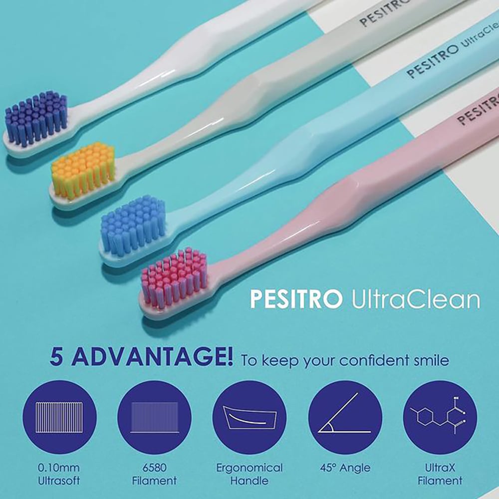 ブラシには0.10mmの極細の特殊な毛材を使用、1つのヘッドに6,580本植毛することで、柔らかな心地よい歯磨きを可能にしました 。この 柔らか め の 毛 が 歯 茎を傷つけることなく歯を効率的にきれいにします。この特長的な毛は世界中の歯科医から支持されています。健康な歯を保ちいつも笑顔で!口腔ケア専門チームによって開発された高品質の歯ブラシです。 健康な歯と歯茎のため、PESITRO社の口腔ケア専門チームが下記の歯磨き方法を推奨しています。 ①起床後すぐ、毎食後、就寝前にPESITRO社の歯ブラシシリーズを使ってよく磨きましょう。一日少なくとも3回、毎回2分間磨きましょう。 ②少なくとも一日1回は、PESITRO社の歯間ブラシを使って、歯ブラシだけでは届きにくい部分の 歯垢をきれいにしましょう。 ③仕上げに洗口液を使い口内をすっきりさせ 細菌から守りましょう
